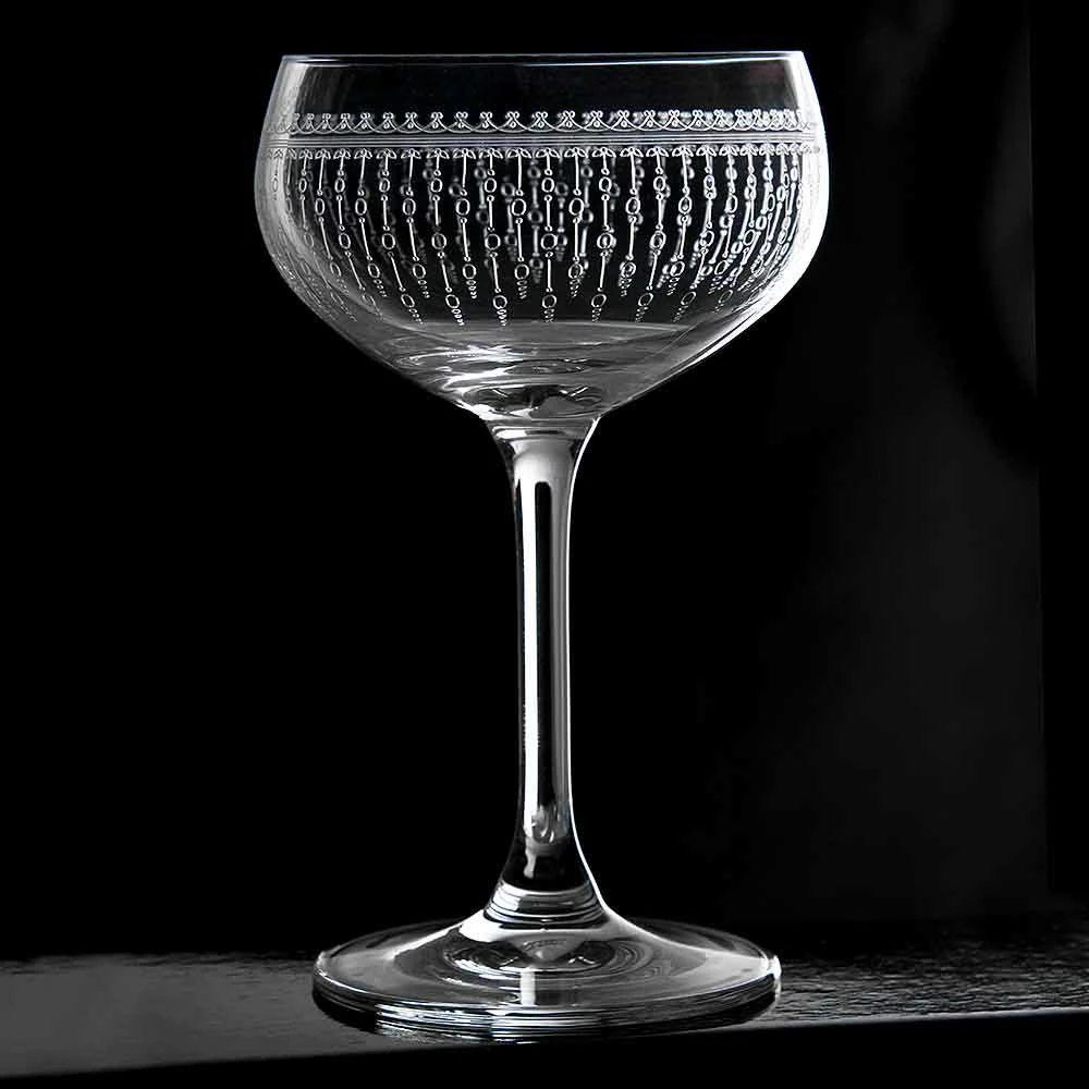 - Etched pattern around the bowl mirrors the movement of bubbles in sparkling drinks