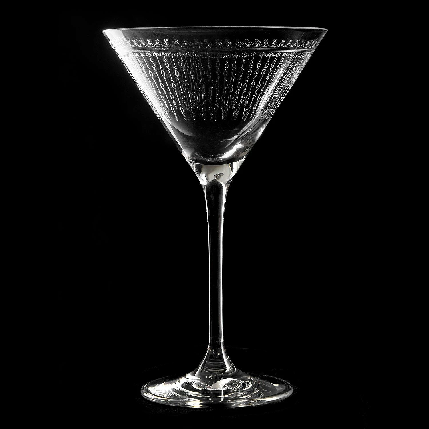The 1920 pattern emulates the movement of bubbles in a sparkling drink. Due to the delicate etched design on the v-shaped bowl, extra visual depth is added to your cocktails.