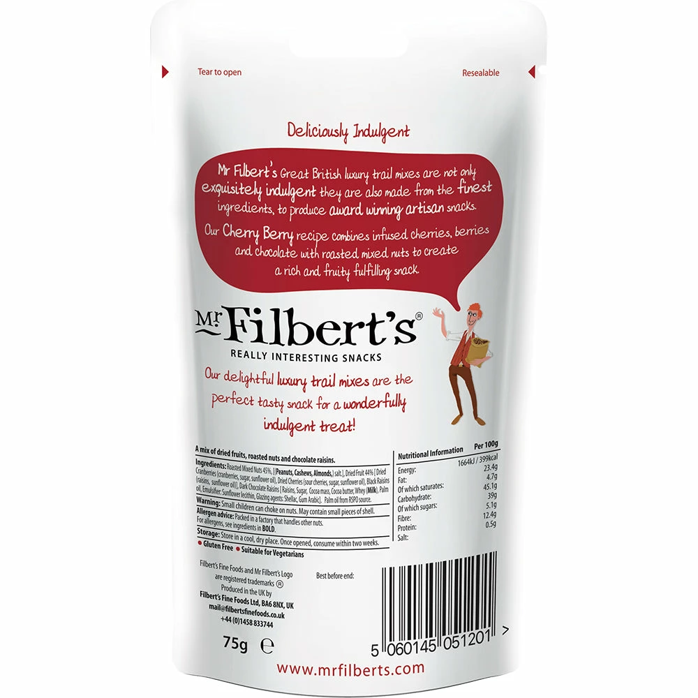 The nuts in our Cherry Berry Chocolate and Nut Mix are hot-air roasted before we add the indulgent infused cherries and chocolate-coated raisins. This delicious snack is deliciously irresistible, the perfect sweet treat any time of day.