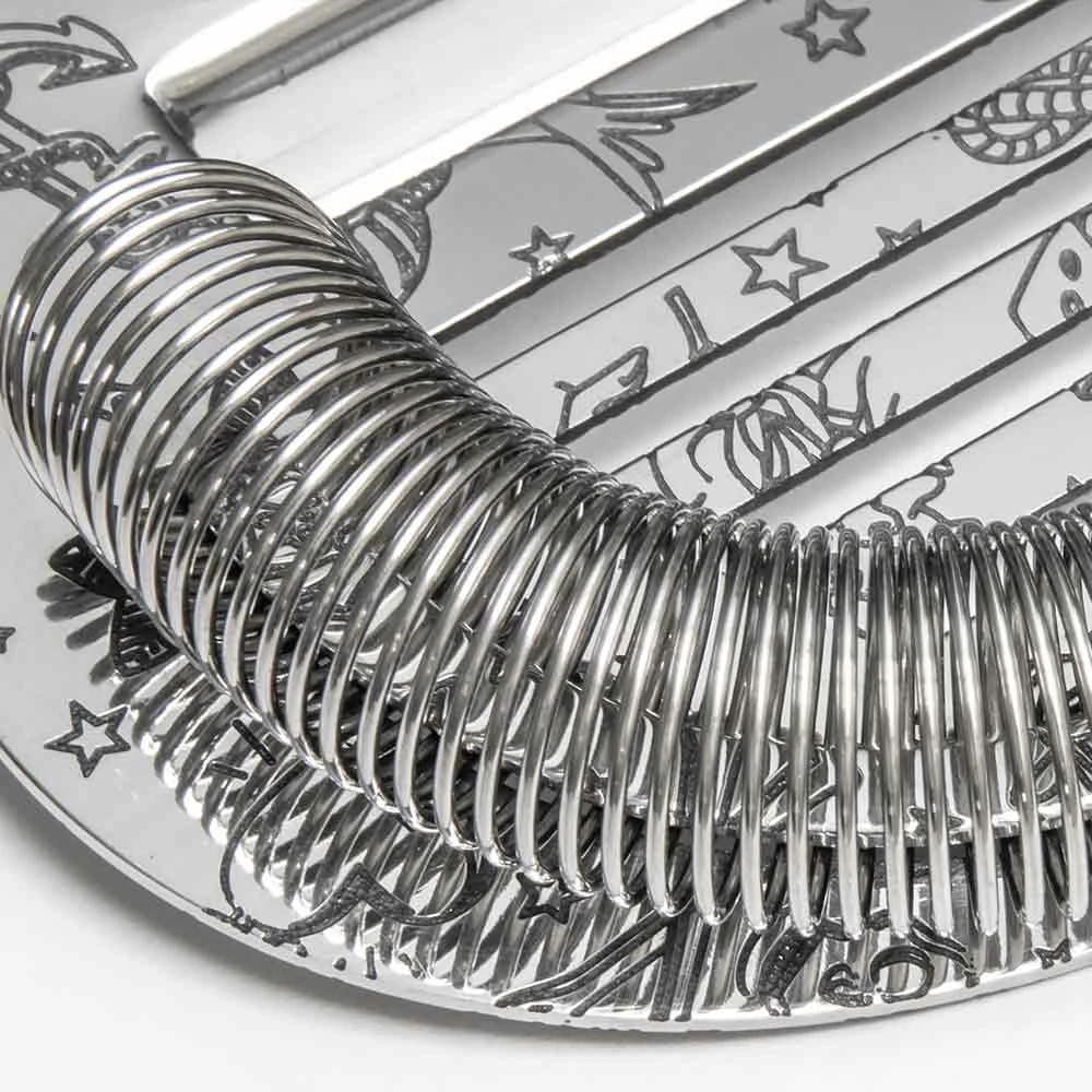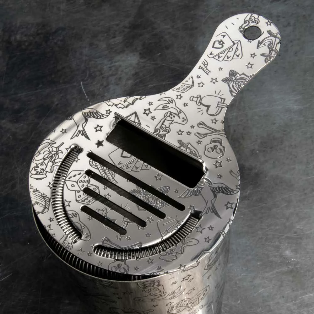 Premium steel hawthorne strainer with a tattoo themed etched pattern. The Tattoo Coley Strainer features stunning icons emboldened with black food-safe ink.