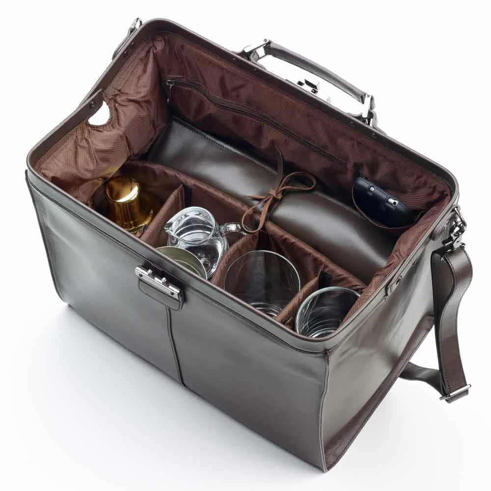 The ultimate bartender bag, the Leather Kit Bag is hand made from premium brown cow hide. Inspired by traditional doctor’s bags, this large bag is as much for show as it is functionality.