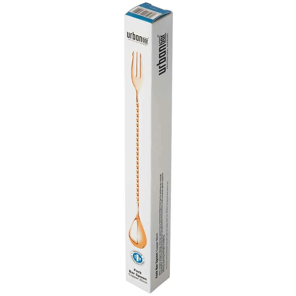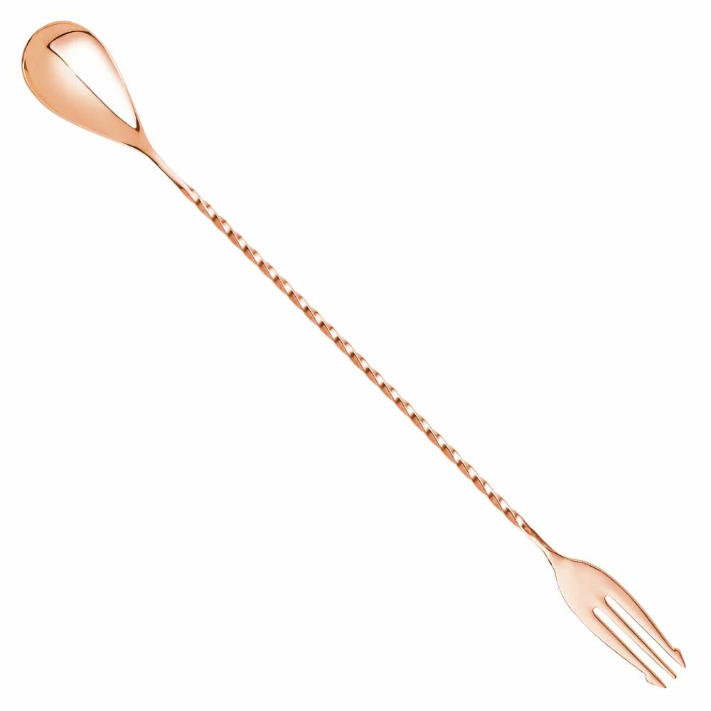 Maximise your efficiency with the Copper Trident Bar Spoon 30cm. With a standard spoon head and twisted stem, this mixing spoon features a fork tip for piercing solid ingredients. Perfect for pairing with a garnish caddy, this elegant bar spoon helps increase functionality behind the bar.