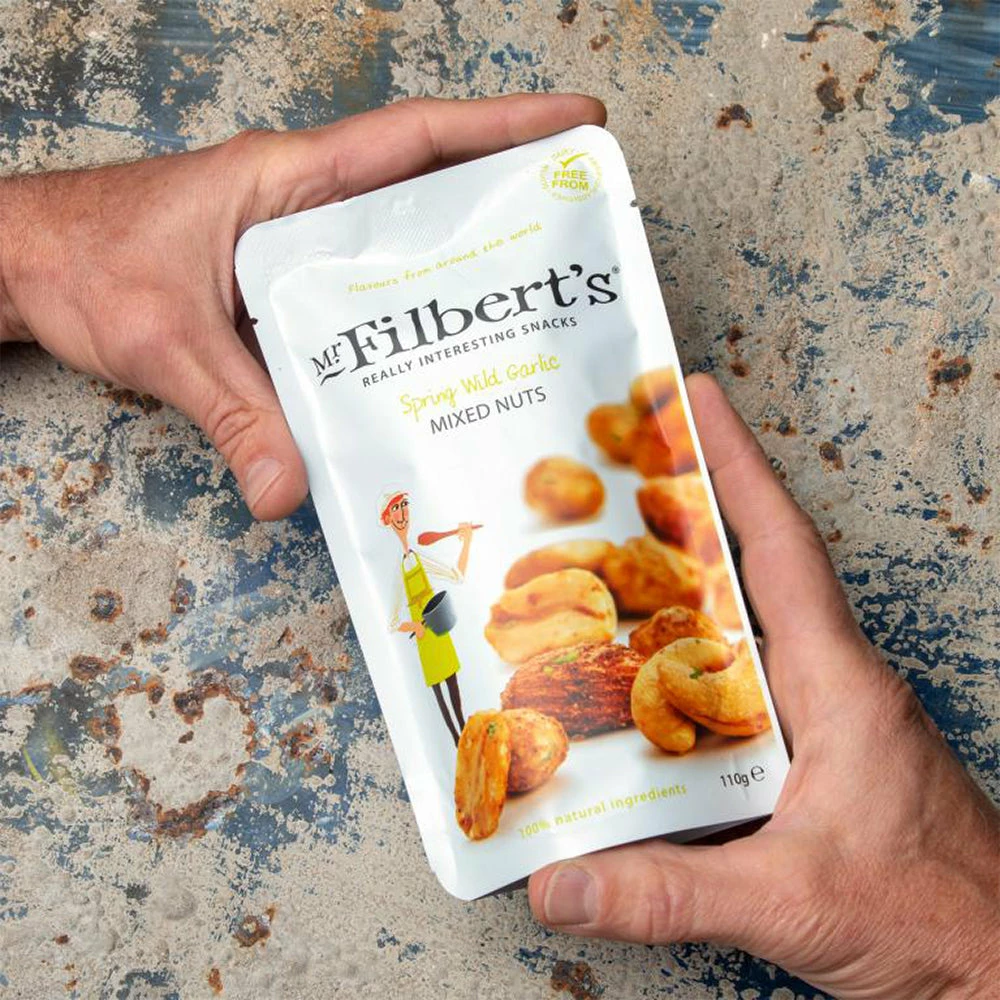 Peanuts, Cashews, Almonds and Hazelnuts are hot-air roasted before being tumbled with hand-picked wild garlic and herbs.