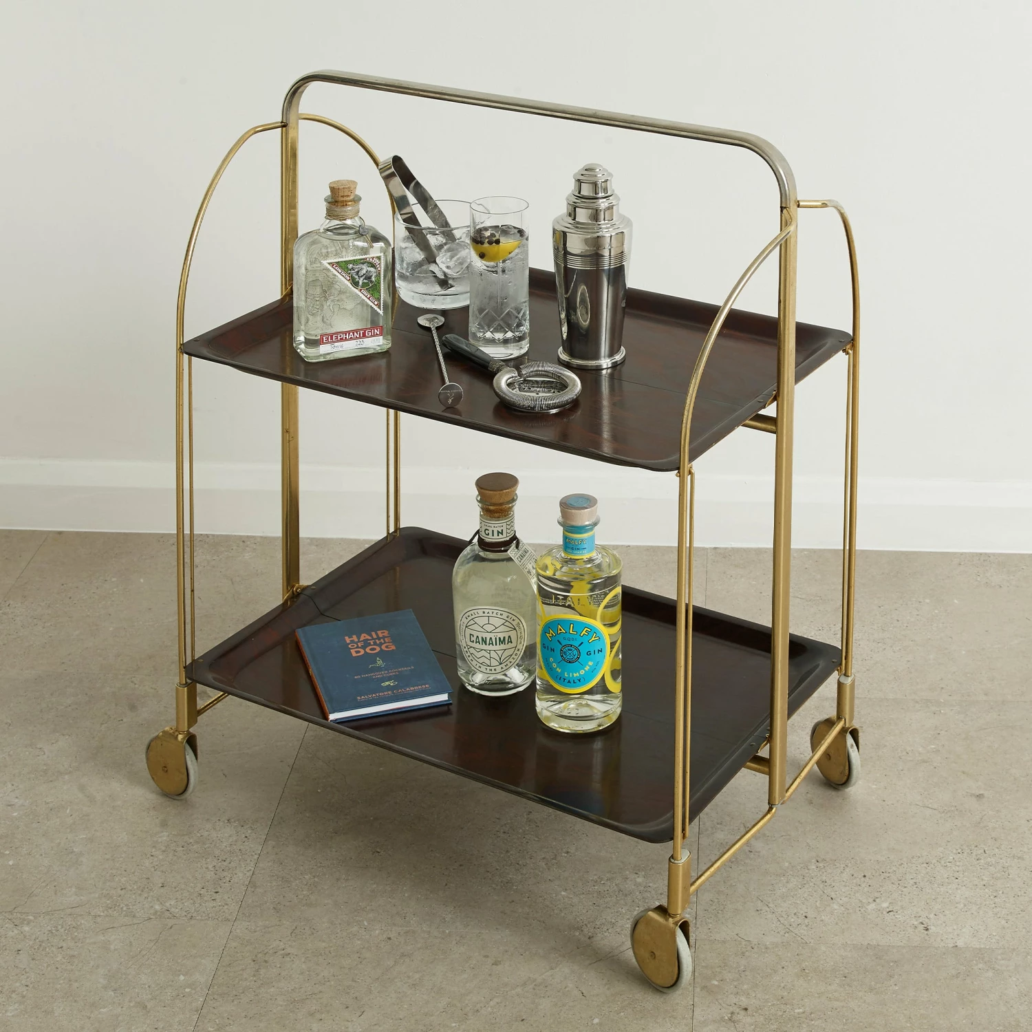 1950s folding trolley with dark plastic trays, gold metal colour frame and rubber wheels. Suitably work but in good condition.